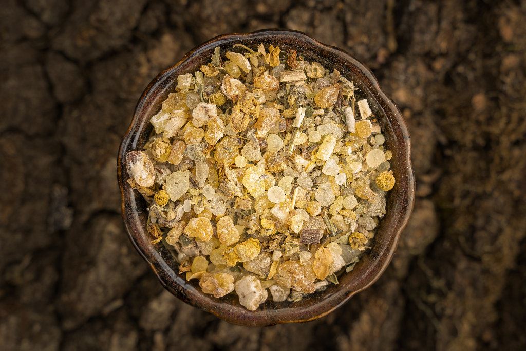 Bestandteile: Dammar weiß, Mastix, Weihrauch, Kräuterbüschl: Alantwurzel, Beifuß, Eisenkraut, Johanniskraut, Kamille, Königskerzen, Melisse, Pfefferminze, Salbei, Schafgarbe
