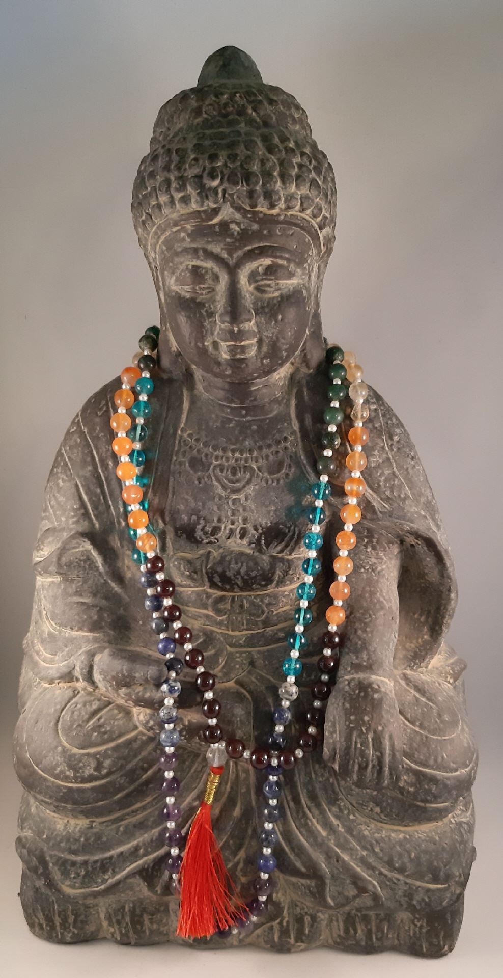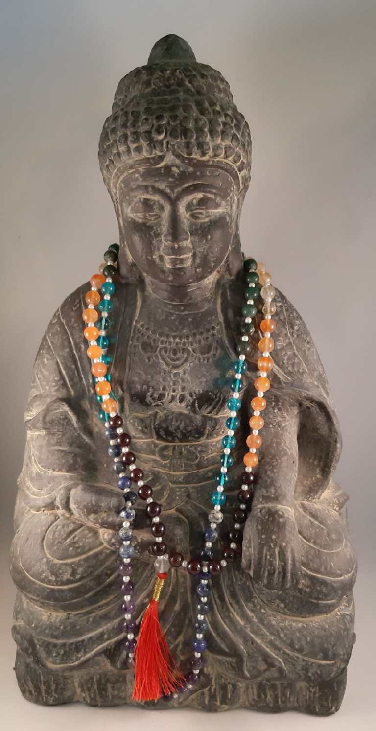 Chakren Edelsteine: Rot - Granat; Orange - Karneol; Gelb - Citrin; Grün - Grüner Aventurin; Hellblau - Aqua Aura; Dunkelblau - Lapislazuli; Violett - Amethyst. Die Mala harmonisiert währen der Meditation die Chakren.