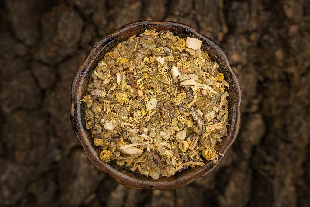 Bestandteile: Angelikawurzel, Benzoe Sumatra, Copal schwarz, Dammar weiß, Holunderblüten, Kamillenblüten, Lorbeerblätter, Nardenwurzel, Pfefferminze