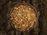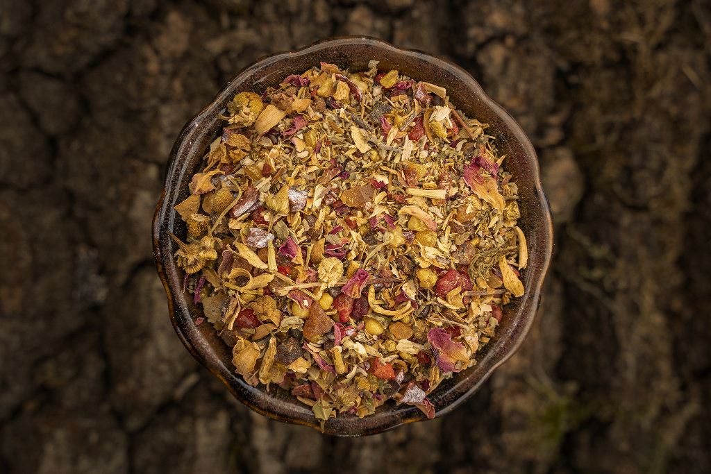 Bestandteile: Damiana, Jasminblüten, Kamillenblüten, Myrrhe, Orangenblüten, Rosenblüten, Rosenweihrauch, Weihrauch gold, Weihrauch rot