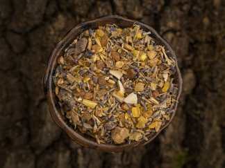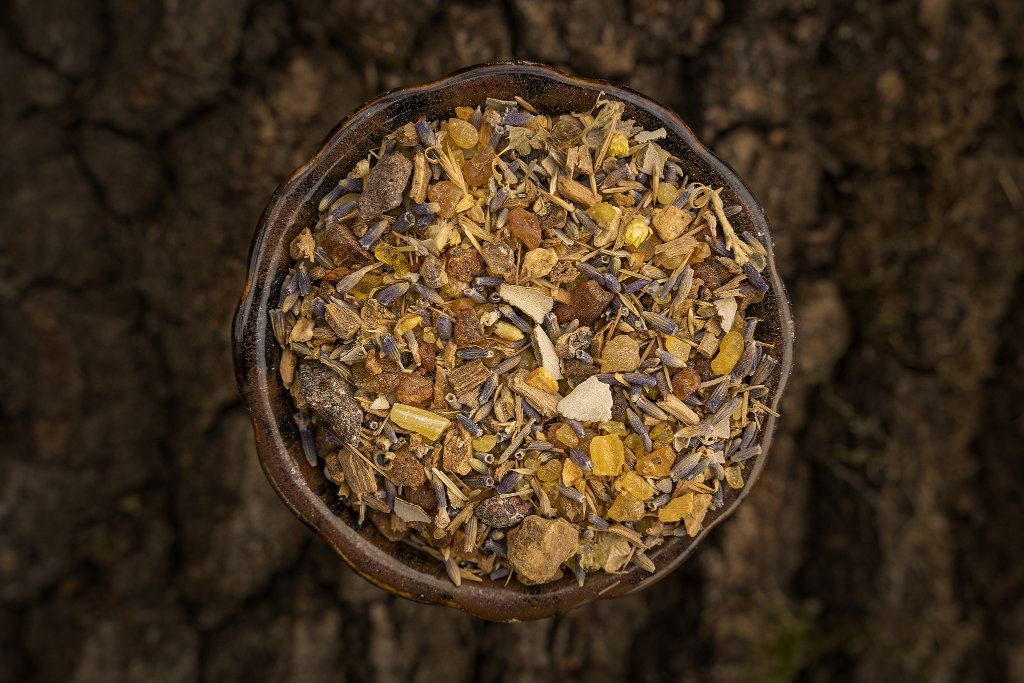 Bestandteile: Alantwurzel, Copal schwarz, Immortelle, Lavendel, Myrrhe, Palo Santo, Sandelholz, Weihrauch Somalia, White Sage