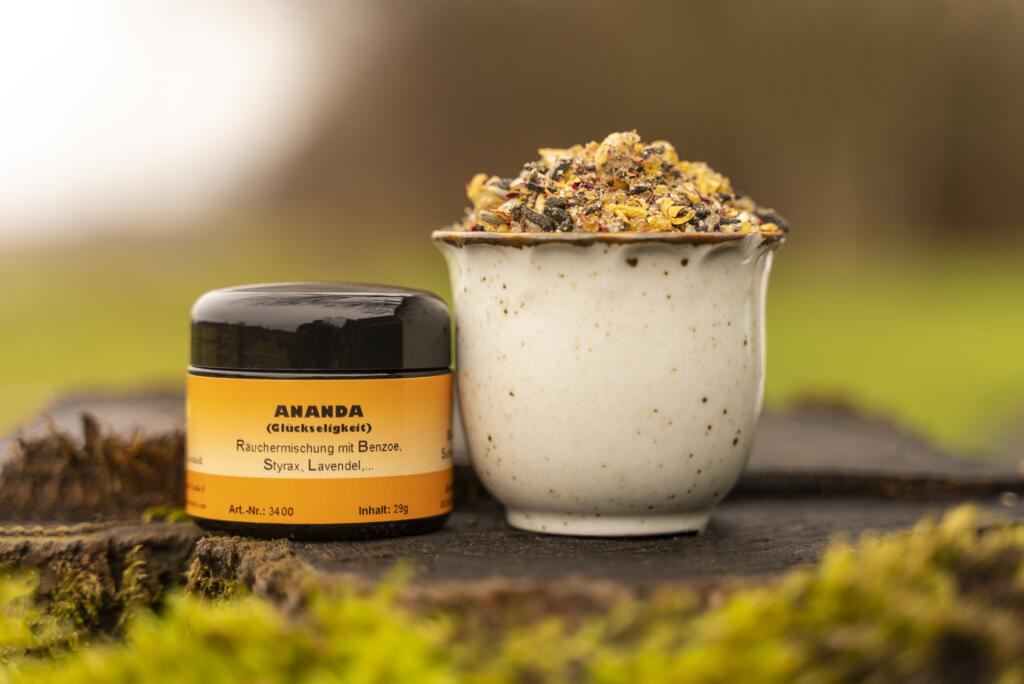 Bestandteile: Benzoe Sumatra, Dammar weiß, Gummi Arabicum, Lavendel, Orangenblüten, Rosenblüten, Styrax, Tonkabohne, Weihrauch Eritrea, Weihrauch Indien, Zimtblüten