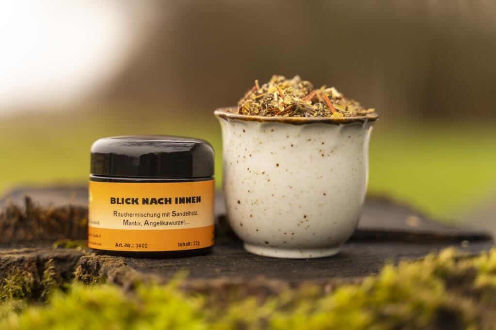 Bestandteile: Angelikawurzel, Beifuß, Dammar weiß, Elemi, Honig Akazie, Lavendel, Mastix, Patchoulie, Sandelholz rot, Sandelholz weiß, Wacholderbeeren, Weihrauch OMAN, Ysop