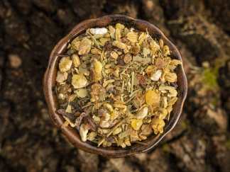 Bestandteile: Angelikasamen, Bibernellwurzel, Eukalyptus, Hibiskus, Kamille ägyptisch, Myrrhe, Pfefferminze, Rosmarin, Weihrauch Maidy