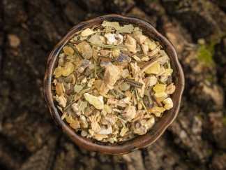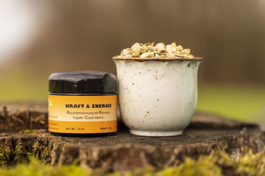 Bestandteile: Bibernellwurzel, Copal weiß, Dammar weiß, Eukalyptusblätter, Ingwer, Lorbeerblätter, Rhododendron Himalaya, Rosmarin, Weihrauch Maidy, Zeder Libanon