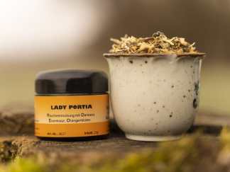 Bestandteile: Damiana, Dammar braun, Eisenkraut, Gummi Arabicum, Eichenmoos, Orangenblüten, Thymian, Weihrauch Akazie, Zedernholz