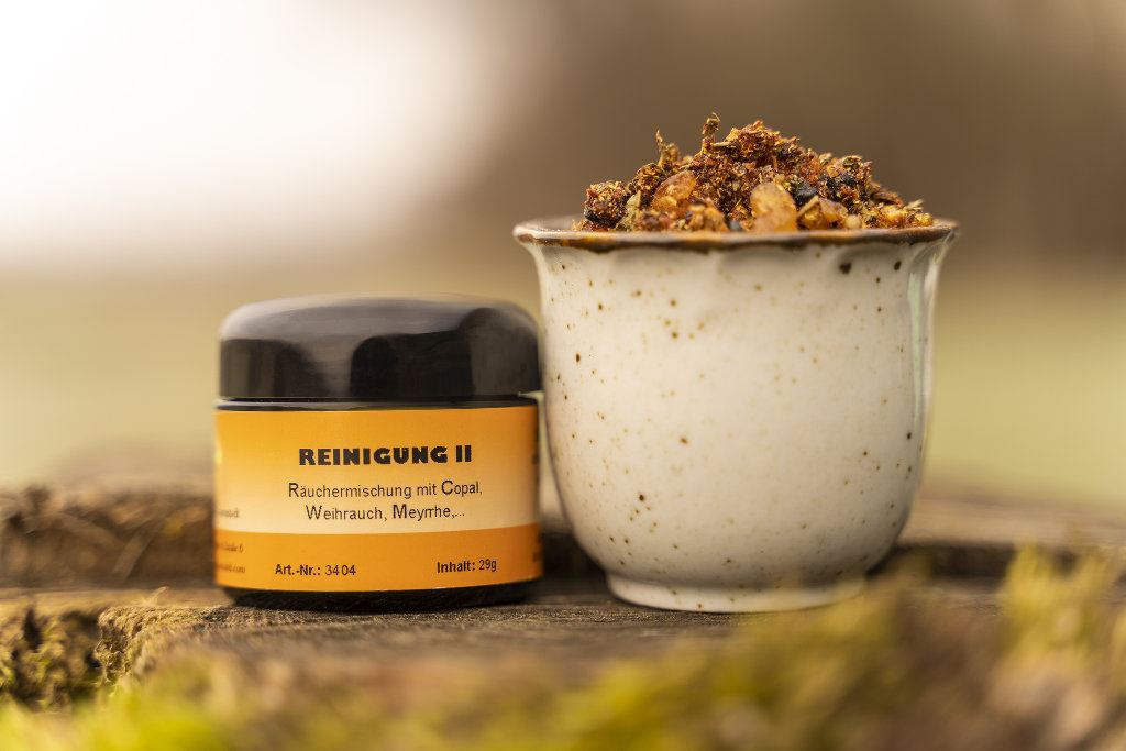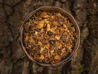 Bestandteile: Angelikawurzel, Bernstein, Copal weiß, Drachenblut, Eisenkraut, Eukalyptus, Kiefernharz, Kamillenblüten, Kampfer, Myrrhe, Weihrauch gelb, Weihrauch schwarz, Weihrauch OMAN, Weihrauch Somalia