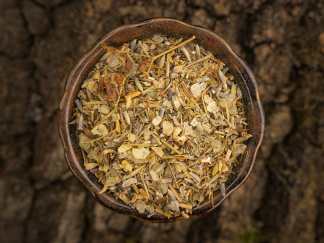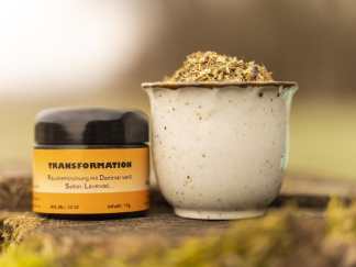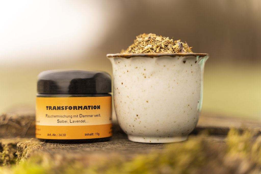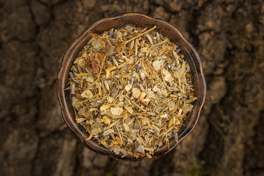 Bestandteile: Amethystpulver, Dammar weiß, Dictamus, Erdrauch, Johanniskraut, Lavendel, Orangenblüten, Pfefferminze, Salbei, Thymian, Wacholdernadeln